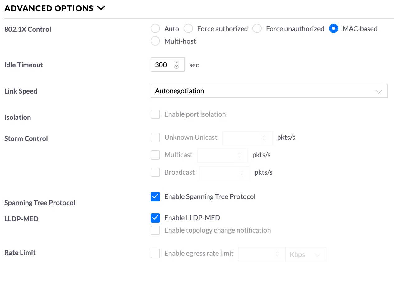 En el lado cableado, la lógica es similar pero utilizando 802.1X Port-Based. Se habilita el 802.1X en la sección correspondiente de la controladora, se selecciona el tipo «Port Based», se activa «VLAN Assignment» y se marcan los puertos que requerirán autenticación. Sobre esos mismos puertos se aplica un port profile que añade las VLAN10 y VLAN20 como redes untagged, asegurando que el modo de control 802.1X esté en «Auto» para que el switch haga la negociación cuando detecta un cliente.